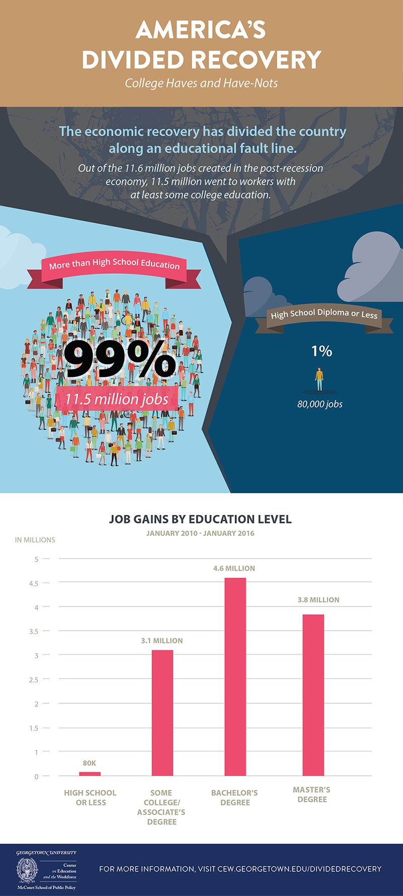 “Out of the 11.6 million jobs created in the post-recession economy, 11.5 million went to workers with at least some college education.”